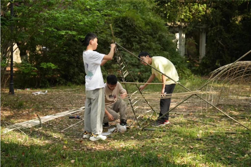 本次建构实践活动的设计主题是以湖湘文化的重要组成部分“竹文化”为切入点,在城乡人居环境品质提升改造中发挥在地材料的特性。通过观察了解,人们在日常生活中对社区绿地与花园等公共空间存在一定的心理需求,学生建构的装置将作为载体,为城市绿地和花园等公共空间提供更好、更美观、健康、舒适的生活和活动空间。同时也发掘竹作为设计与建造材料的可能性,充分发挥竹材及湖湘传统竹艺、竹技,在建造实践中传承传统文化、坚定文化自信。200余名学生在学院实践基地用了八天时间完成了23个作品。从概念萌芽到认真制作,同学们克服了各种困难齐心协力,以原竹与竹片为原料,经过八天紧张的搭建,将各自的设计作品完整呈现在大家面前。