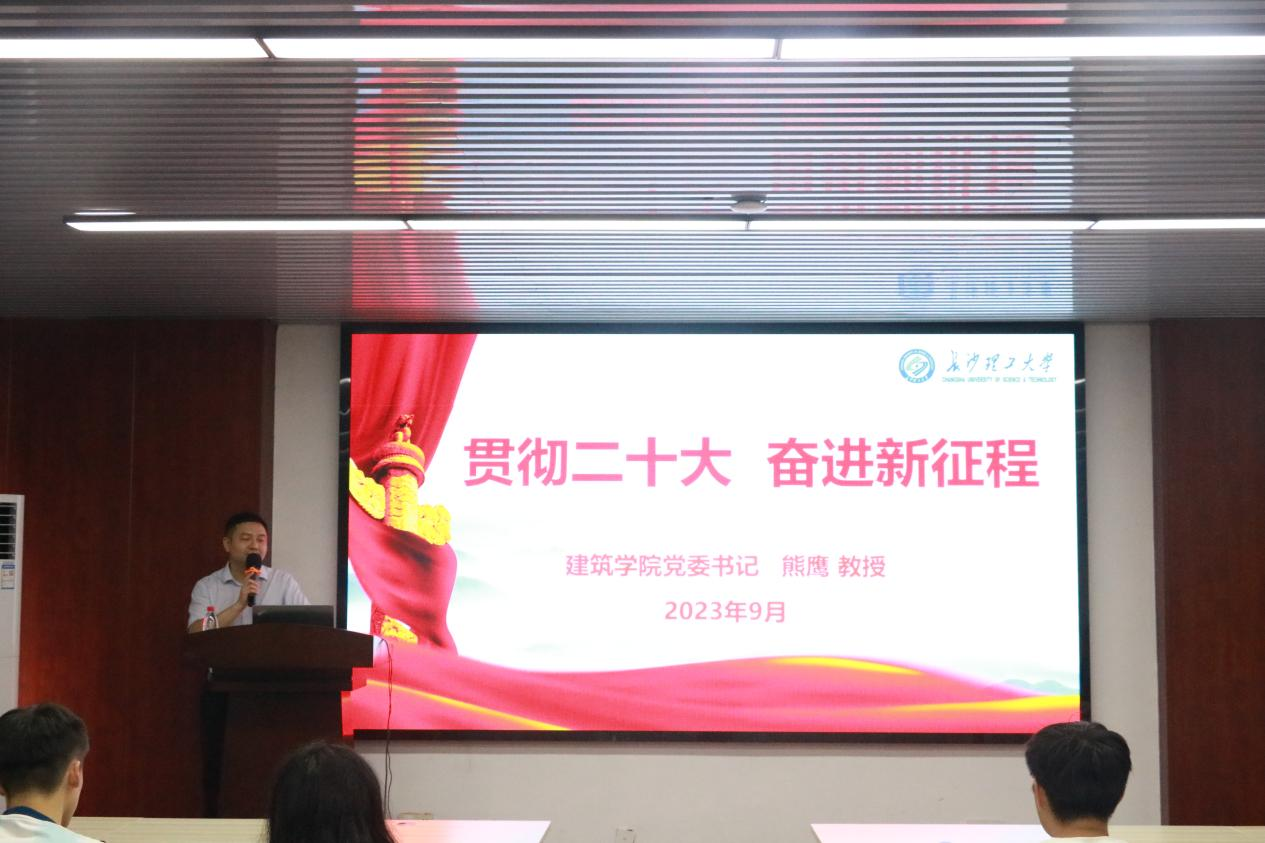 2023年9月20日下午15点,建筑学院2023级研究生新生第一堂党课暨党的二十大精神学习在金盆岭校区16教314召开。建筑学院党委书记熊鹰教授主讲,2023级全体研究生新生参与。