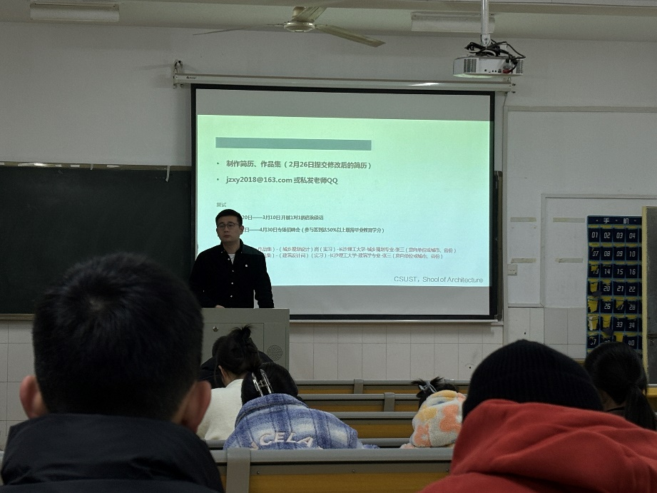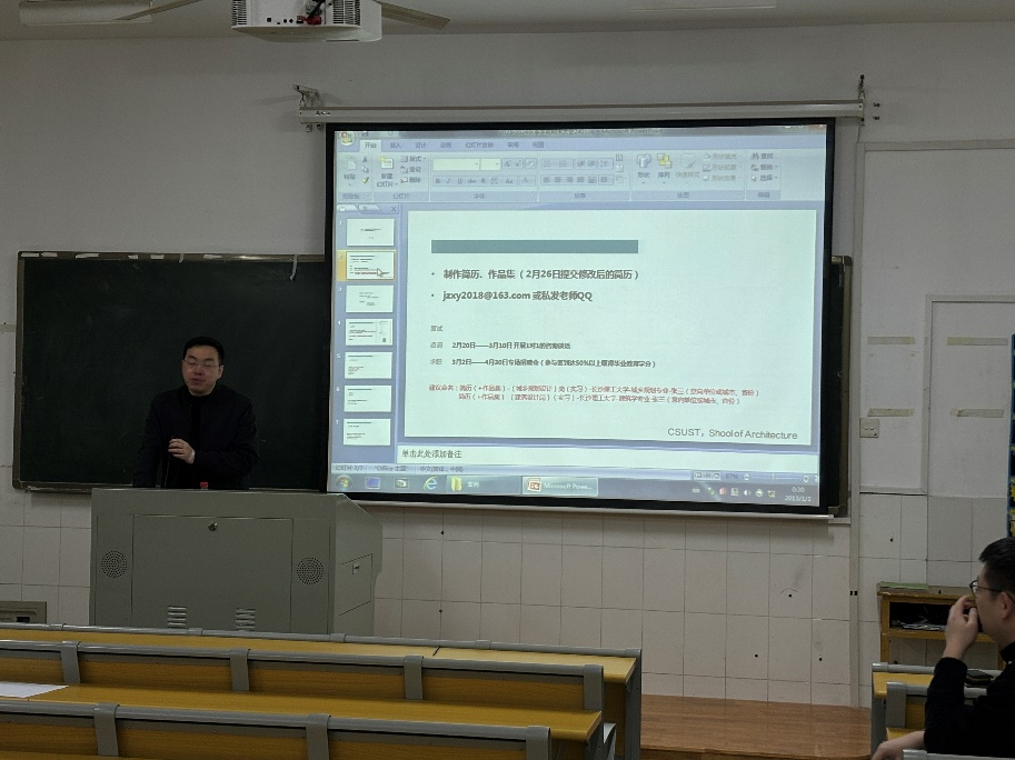李家春副书记讲解就业形势,对本院学生毕业去向作殷切关怀。目前就业形势严峻:设计院无增量项目,人才需要降低;其他相关用人单位对本专业需求少。期望学生们寒假动用资源,积极争取,做好充足准备。提高自身就业竞争力,破除学历门槛,在人才市场饱和的当下努力发挥自身优。同时结合意向单位用人需求,做好求职面试准备。
