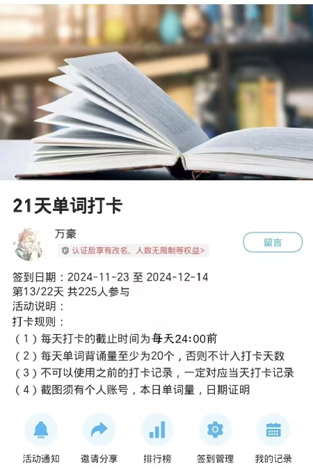 2024 年 11 月 23 日至 12 月 14 日,建筑学院开展“单词筑梦路,勤勉报国情”21天打卡活动。建筑学院学子积极参与。