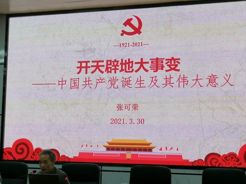 宣讲会上,张可荣教授以“开天辟地大事变——中国共产党诞生及其伟大意义”为题,从“振兴中华需要马克思主义政党领导”、“五四新文化运动与马克思主义传播”、“中国共产党诞生的历史过程”、“中国共产党诞生的伟大意义”等四个方面,运用详实的史料,深入浅出地阐述了中国共产党诞生的历史背景、历史条件、历史过程及其伟大意义,对党的诞生光辉历史进行了深入解读、剖析、阐释。他指出,中国共产党诞生孕育的“红船精神”,“开天辟地、敢为人先的首创精神,坚定理想、百折不挠的奋斗精神,立党为公、忠诚为民的奉献精神”,是中国共产党革命精神谱系的源头,彰显了党的初心与使命。他号召大家,在党史学习教育中体悟党的永恒初心与千钧使命,汲取党的创建历史沉淀的精神力量,传承红色基因,弘扬“红船精神”,为党的教育事业,为学校的发展做出新的贡献。
