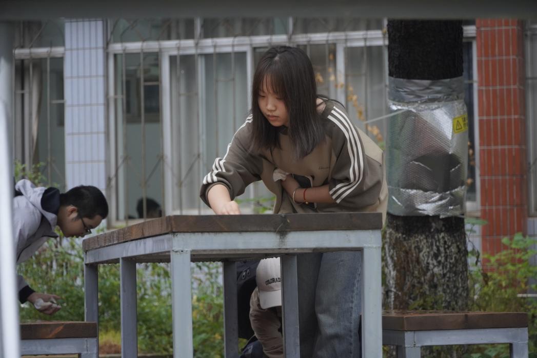 (学生在擦拭桌子)