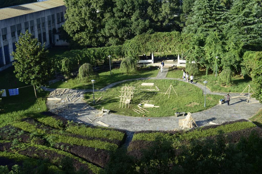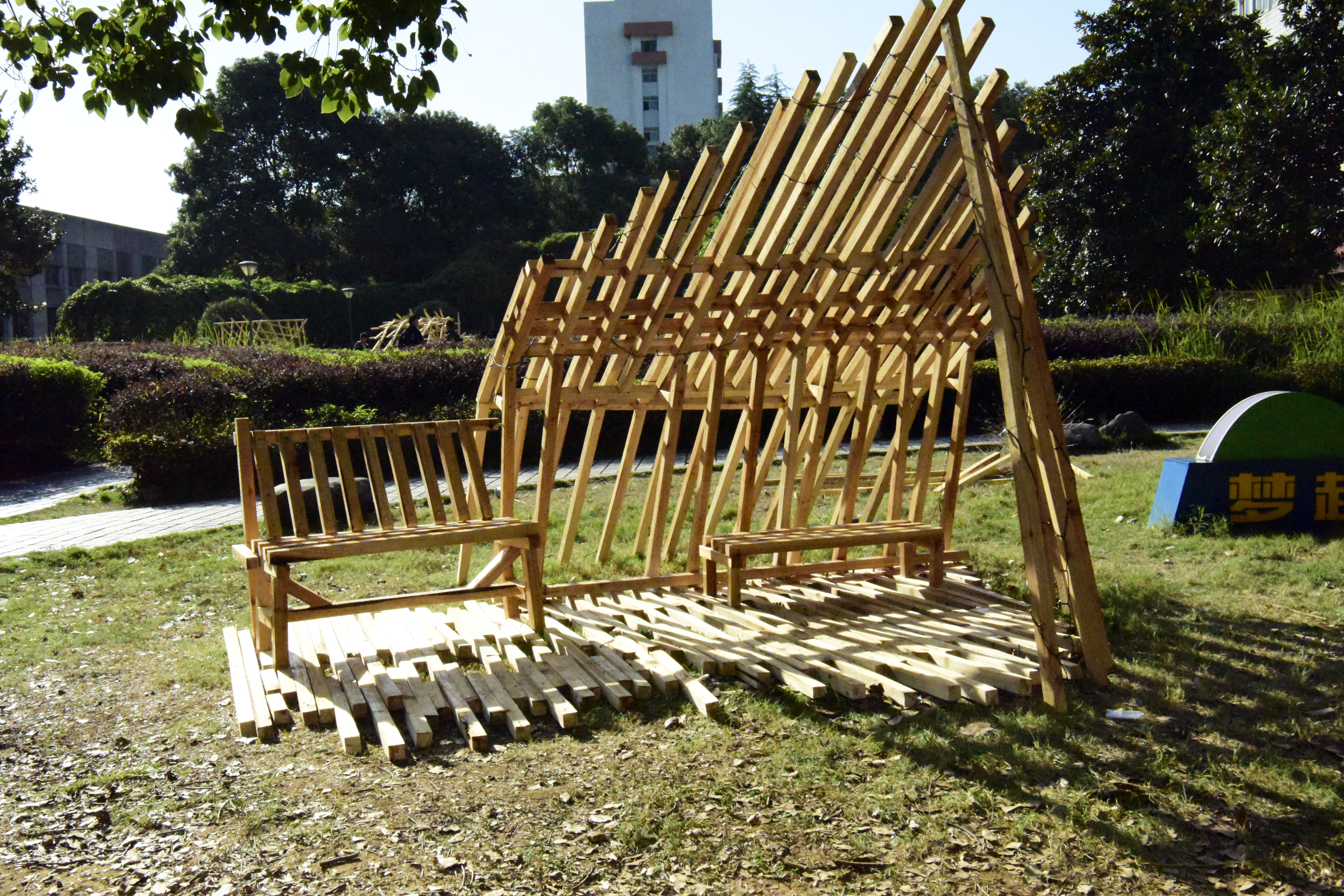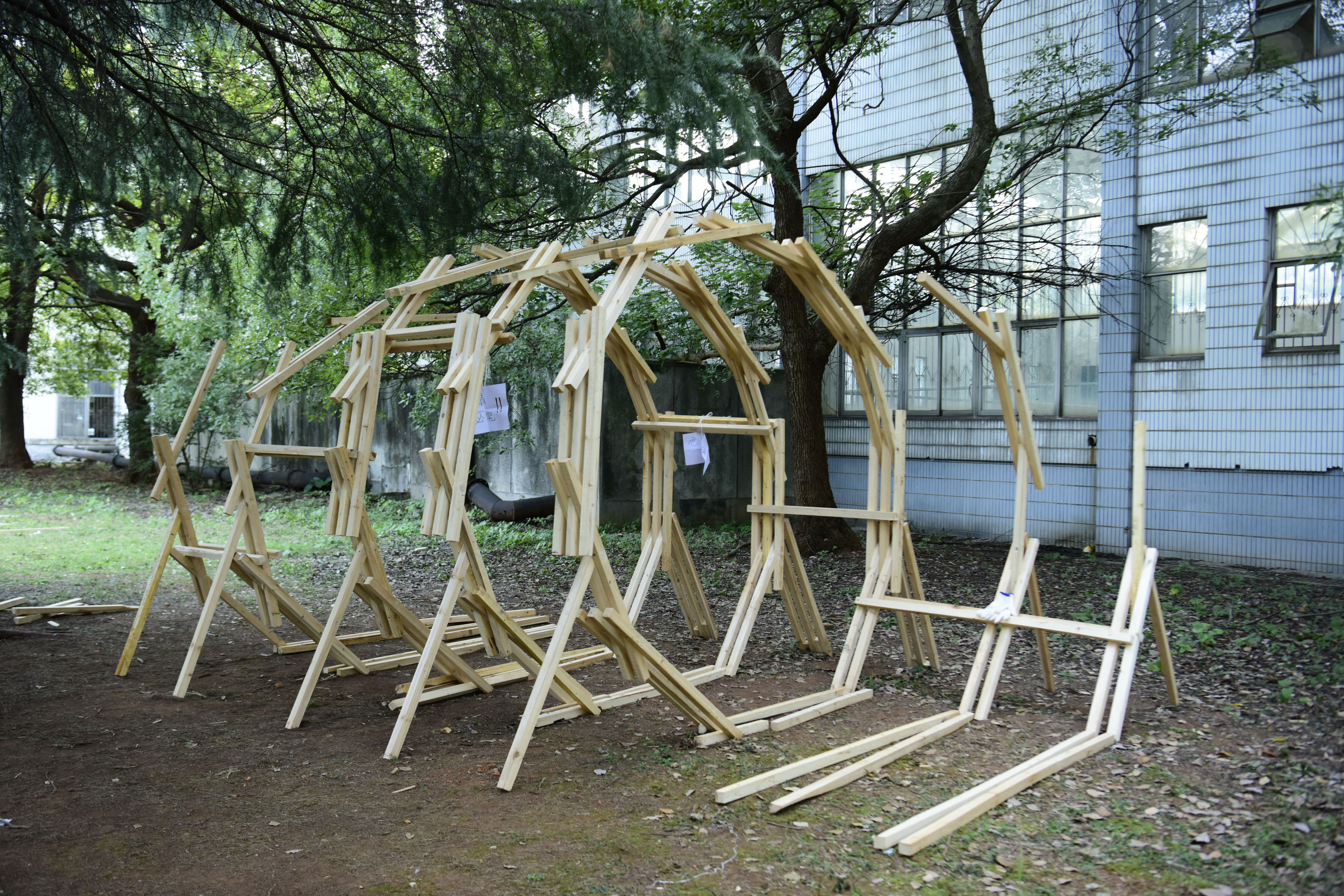本次建构实践活动运用木材,学生小组自发组织、合作进行。建构成果要求构筑物成品、PPT、建构视频、A0展板等。在老师的指导下,每个学生团队设计方案,开展讨论,分工合作,理解木材的特性,掌握空间构成技法,学习榫卯等连接方式,并不断思考如何将建筑与环境有机结合。随后,学生们制作草模、试做榫卯、初建框架,将方案与实际结合,不断修改和调整榫卯的形式、承重的结构、作品的功能性和人体尺度,将作品做结实、做稳定、做舒适。从方案设计的彷徨到搭建成功的欣喜,他们克服了重重困难,无论昼夜、无论风雨。木构优秀成果的展出,不仅融合了校园自然风光,展现了建筑学院欣欣向荣的精神态势,还成为了长理校园一道美丽风景线。