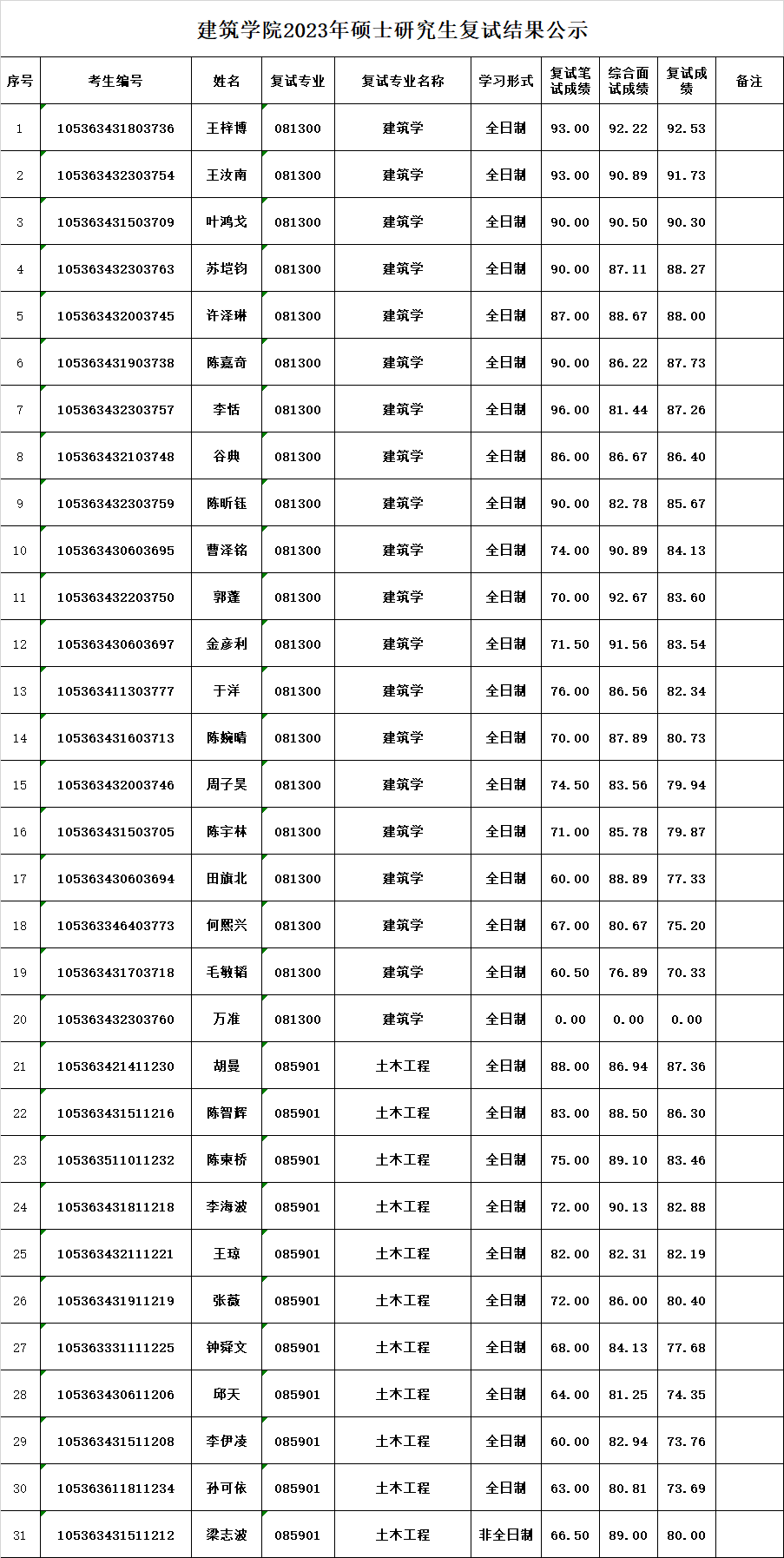建筑学院2023年硕士研究生复试结果公示