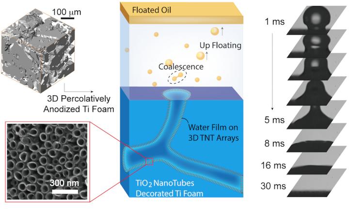 近日,由LETOU官网贾传坤教授团队和重庆大学孙立东教授、中科院金属研究所韩拯研究员共同主导,联合新加坡科技局化学与工程研究院等国际团队,在油水分离研究技术方面取得了突破性进展。团队开发出一种渗透阳极氧化法,实现了在多孔钛三维微通道内(孔径10-100微米,厚度1-5毫米)超亲水涂层全覆盖,使水滴在多孔钛的渗透速率提高5个数量级,并且油水乳液经微通道过滤获得了高纯水相,其总有机碳含量低至25ppm以下,油水分离效率达到99.9%以上。该项研究成果于2018年8月31日在Cell出版社旗下子刊iScience期刊上公开发表。