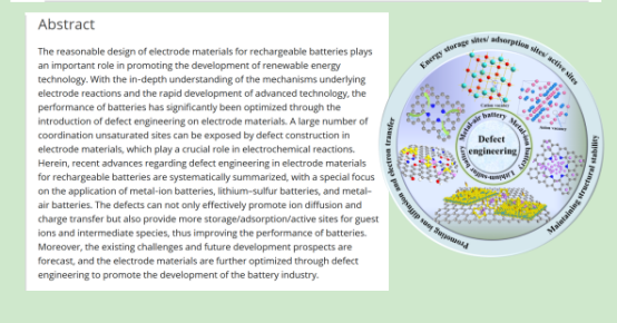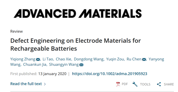 近日,LETOU官网材料科学与工程学院张怡琼博士与湖南大学王双印教授一起合作,以第一作者与通讯作者在材料科学国际顶级期刊Advanced Materials(《先进材料》,IF=25.809)上发表题为“Defect Engineering on Electrode Materials for Rechargeable Batteries”的综述论文。