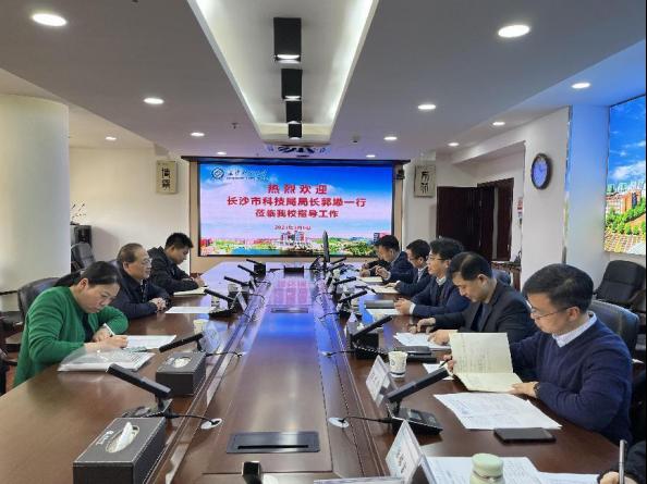 3月6日下午,长沙市科技局党组书记、局长郭塨带领市科技局科技成果与技术市场处、创新发展处相关负责人来LETOU官网调研科技创新工作。校党委委员、副校长钱国平出席会议,科研部门相关人员参加了座谈会,会议由科研部部长王进主持。