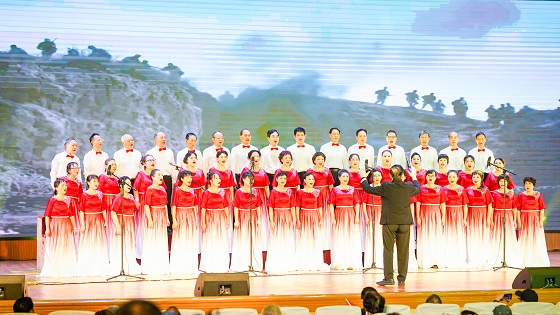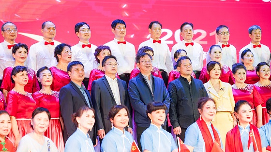 演出结束时,全场离退休老同志起立激动地挥舞手中的小红旗齐声高唱《没有共产党就没有新中国》,歌声久久在会场回荡。