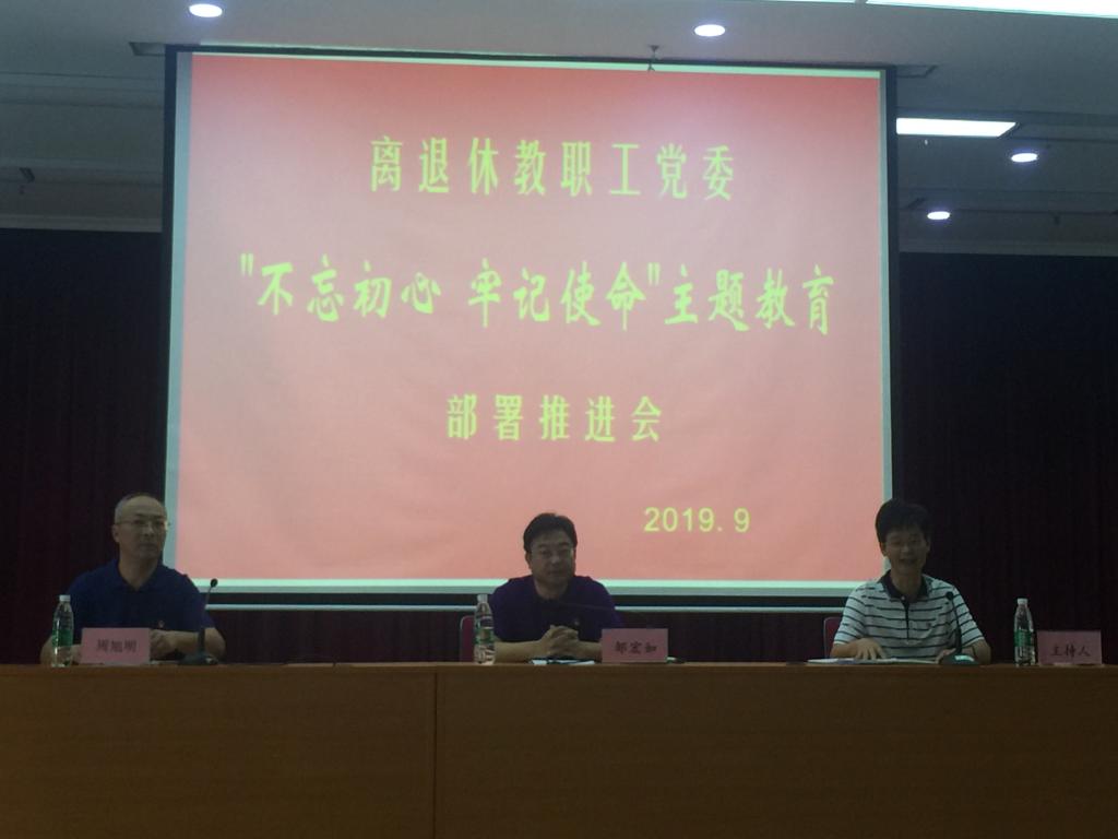 刘朝辉就离退休教职工党委开展“不忘初心、牢记使命”主题教育实施方案从总体要求、工作安排、组织保障三个方面进行部署,他要求大家提高政治站位,切实抓好主题教育,并对近期开展的几项重要工作进行了安排。