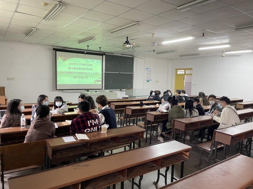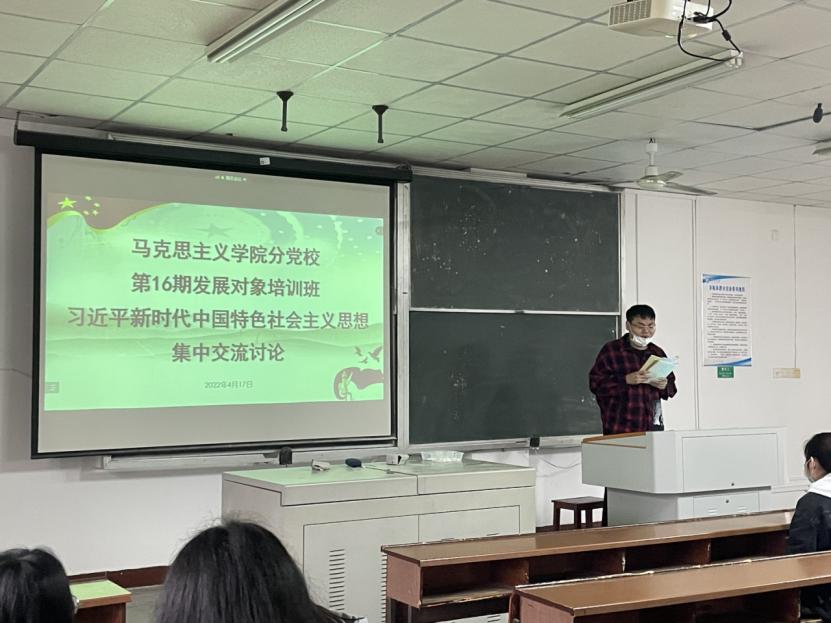 2022年4月17日上午,马克思主义学院2022年上期发展对象培训班于金盆岭4教509教室开展《习近平新时代中国特色社会主义思想集中讨论课》的学习。本次学习活动围绕习近平新时代中国特色社会主义思想网络视频课程开展集中交流讨论,马克思主义学院全体发展对象参加,党员代表侯彭振、刘竹竹、钟雅琦负责监督。