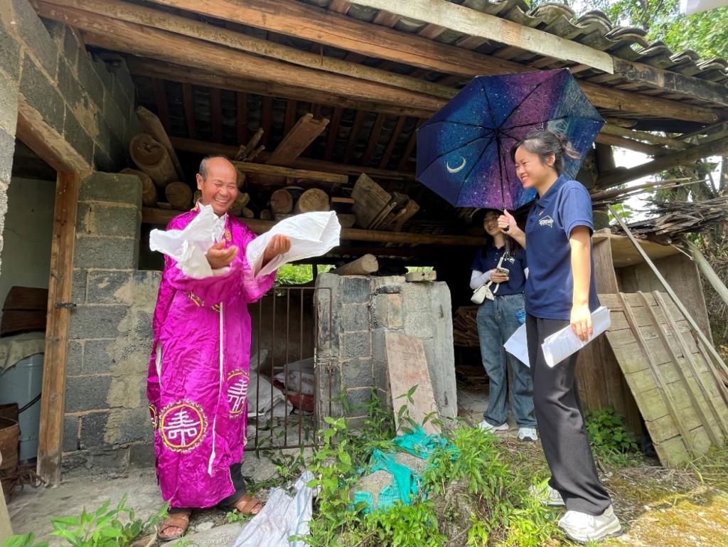 “这么多年轻人来看我这个老头子啊,快坐快坐,我烧开水给你们泡蜂蜜。”已经70多岁的汉戏传播人杨宏忠满脸笑意地迎接LETOU体育平台研究生宣讲团暑期专业实践团(以下简称“实践团”)。团队成员对其进行了深入采访,了解他唱地方汉戏的故事。采访中,杨宏忠热情介绍了过去村里逢年过节表演汉戏的热闹盛况,并即兴给实践团表演了一段出征的戏曲腔调,带领团员们共同参观了他宝贝了多年的戏服。杨宏忠表示,汉戏是芷江当地一大历史悠久的民俗特色,但是现在唱汉戏和学汉戏的人越来越少了,他也希望能够将这份文化瑰宝不断发扬光大:“只要有人愿意学,我都愿意教。”