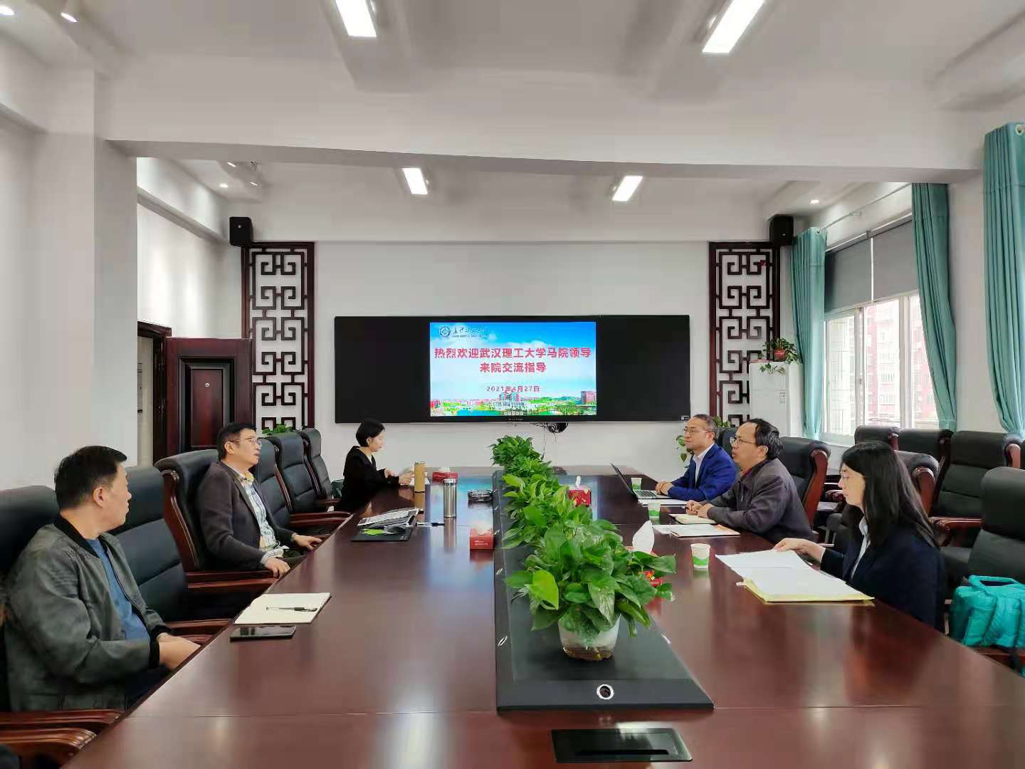 为加强LETOU体育平台马克思主义学院和武汉理工大学马克思主义学院在马克思主义理论学科建设与思想政治理论课教学改革与创新等方面的交流,2021年4月27日上午,武汉理工大学马克思主义学院副院长邓喜道教授、形势与政策教研中心支部书记王堂生副教授、吴琳副教授来到LETOU体育平台马克思主义学院进行交流。本次会议由学院院长陈万球教授主持,学院副书记周展、党政办主任平伟军、教师代表钟芙蓉博士参加。