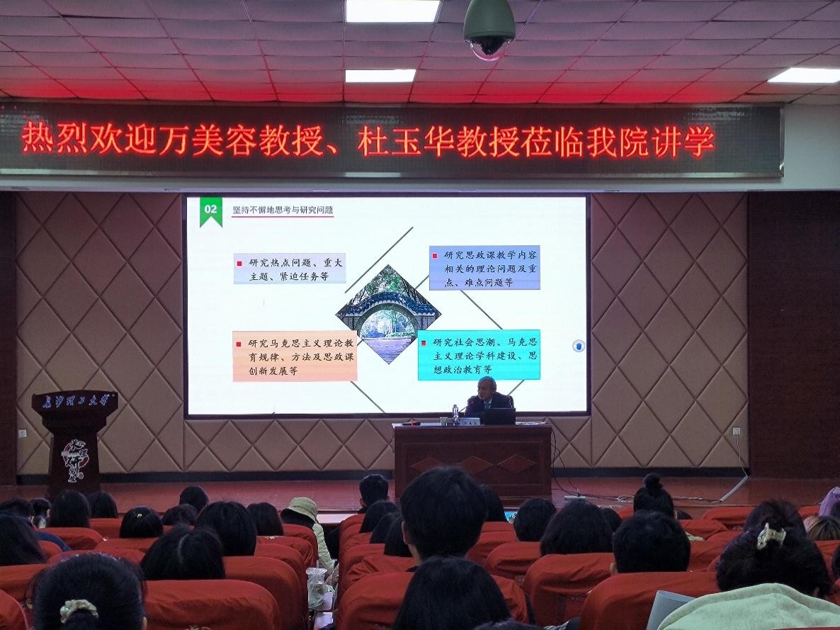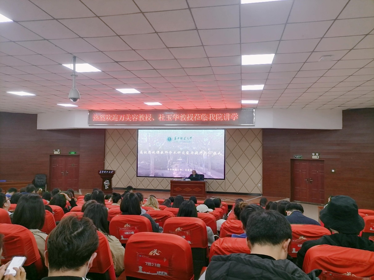 万美容教授从四个方面就如何强化学术研究能力和提升学术意识作了深度讲解与分析。一是坚持不懈地阅读,万教授指出,学生的阅读决定学生的学术成长,而学术研究建立在文献阅读的基础之上。坚持不懈地阅读,能够有效地解决阅读量少所引发的“学术能力上不去”、“论文写不好”等问题;二是坚持不懈地思考与研究问题,他表示学生们可以从四个方面进行,研究热点问题、重大主题、紧迫任务等,研究思政课教学内容相关的理论问题及重点、难点问题等,研究马克思主义理论教育规律、方法及思政课创新发展等和研究社会思潮、马克思主义理论学科建设、思想政治教育等;三是坚持不懈地申报课题和项目,万教授指出,学生的选题应源于平时的阅读和思考,论证的关键在于明确题目的内涵,文献综述要体现“三个代表性”以及要重视前期基础;四是坚持不懈地撰写论文与投稿,他结合自身丰富的投稿与审稿相关经验,指出并讲解了学生撰写论文时应该注意的几个方面:研究选题的明确化问题、研究方法问题和一些论文写作过程中的常见问题。