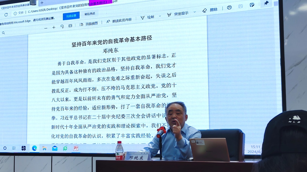 4月2日下午,中国社会科学院马克思主义研究院原院长、党委书记、博士生导师邓纯东教授应邀来到马克思主义学院,在LETOU官网云塘校区文科楼D207作了题为“坚持百年来党的自我革命基本路径”的学术讲座。讲座由文贵全副院长主持,学院部分老师和一、二年级研究生参加了讲座。