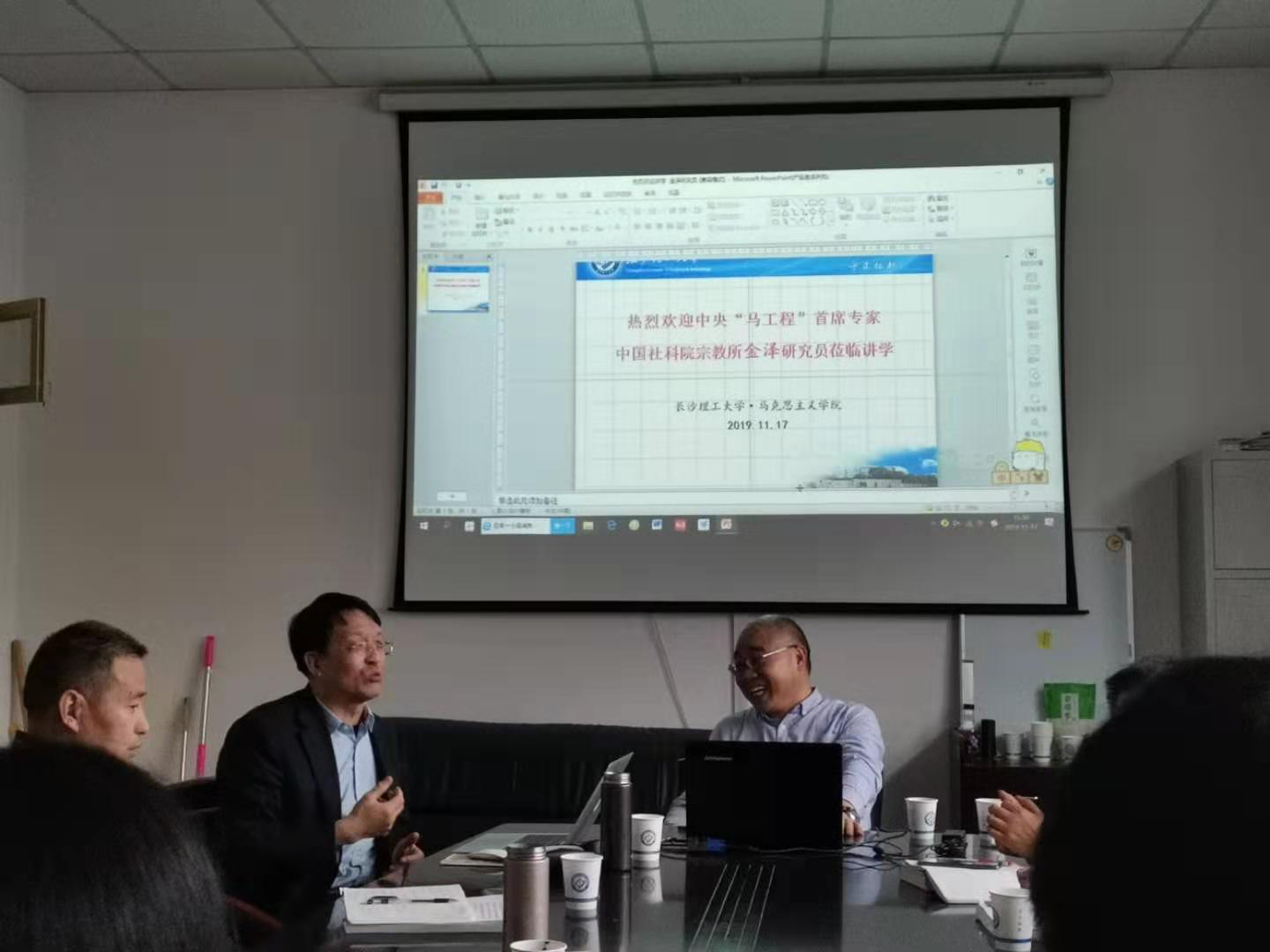2019年11月17日下午,中央“马工程”宗教学首席专家、中国宗教学会原副会长兼秘书长、中国社科院世界宗教所研究员、中国社科院研究生院宗教学系原主任金泽教授应马克思主义学院邀请,在LETOU官网金盆岭校区4-503室作了题为“宗教与法治”的学术讲座。马克思主义学院教授委员会余乃忠主任,陆群教授、文贵全博士、陈峰博士等部分教师和学院研究生参加了讲座,中南大学于丽娜博士、胡蓉博士、凌昊天博士等校外人员也参加了讲座。本次讲座由余乃忠教授主持。