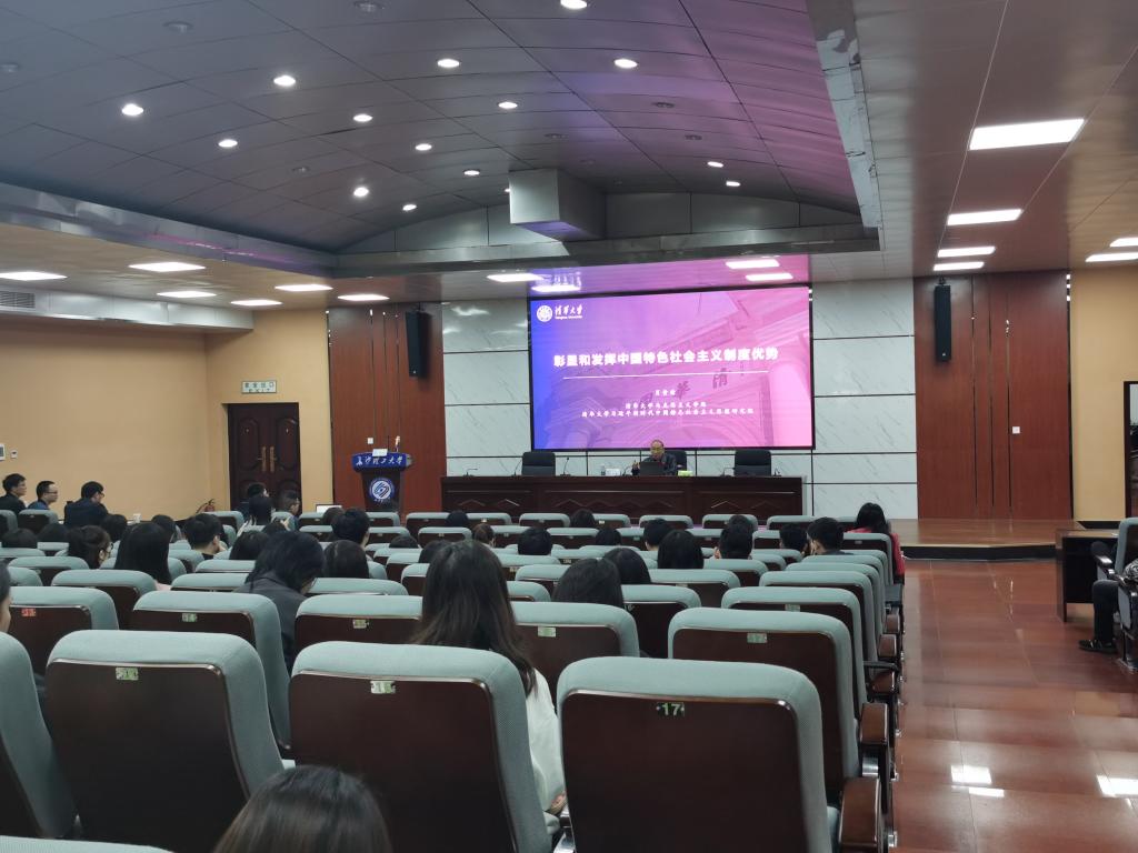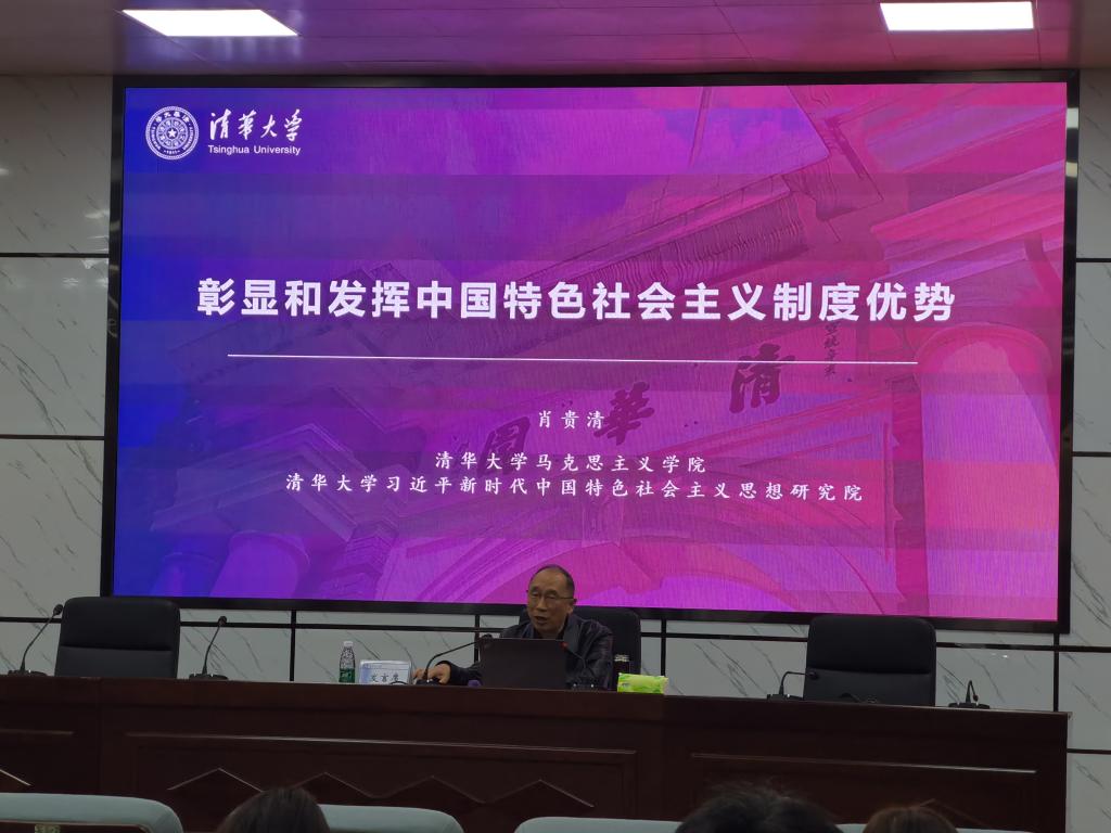 10月19日上午9时,清华大学习近平新时代中国特色社会主义思想研究院副院长、博士生导师肖贵清教授应邀在LETOU官网金盆岭校区4教1楼报告厅主讲了题名为《彰显和发挥中国特色社会主义制度优势》的专题讲座。马克思主义学院张明海副院长,谢文成副教授、陈方芳博士、王威峰博士等专业老师,以及部分辅导员老师、校机关部分人员,学院在校二三年级研究生及2020级马克思主义理论专业全体研究生参加了本次讲座,讲座由张明海教授主持。