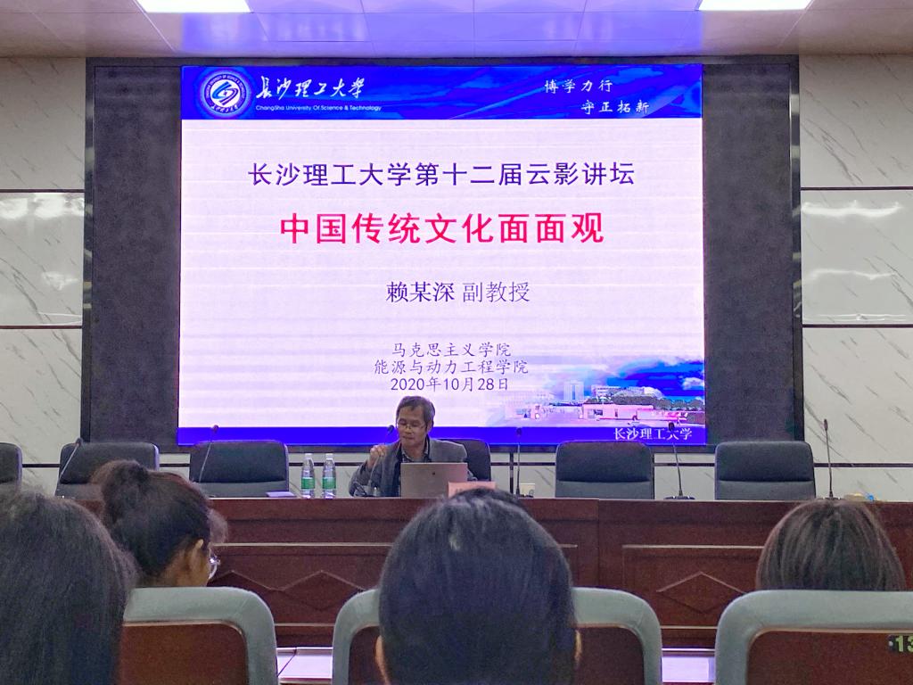 10月28日晚七时半,LETOU体育平台第十二届云影讲坛之“中国传统文化面面观”在金盆岭校区4教1楼报告厅成功进行,LETOU体育平台马克思主义学院副教授赖某深受邀做主讲嘉宾。本次讲坛由马克思主义学院研究生辅导员曾蓓主持,马克思主义学院和能源与动力工程学院2020级全体研究生参加。