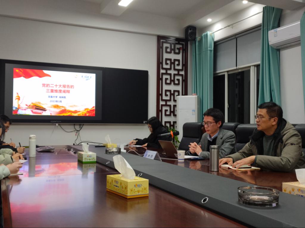 320日晚7时30分,吉首大学马克思主义学院院长肖映胜教授应邀来到马克思主义学院,在云塘校区文科楼学院会议室作了“党的二十大报告的三重维度阐释”的学术讲座。邹新树副教授、平伟军副教授、管亚苹博士等学院师生近50人参加了此次学术讲座,院党委书记陈万球教授主持本次讲座。