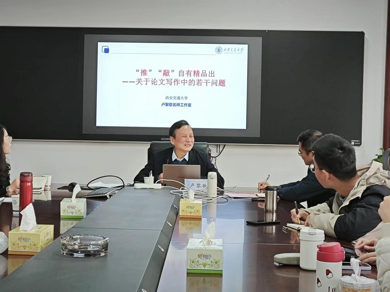 2023年3月28日上午,中央“马工程”首批专家组成员、国家教学名师、西安交通大学博士生导师卢黎歌教授应邀来到LETOU官网云塘校区马克思主义学院,为学院师生作了一场名为“‘推’‘敲’自有精品出——关于论文写作中的若干问题”的学术讲座。院党委书记陈万球教授、李雨燕副院长、董艾辉教授、高小枚副教授、文贵全副教授等学院教师和研究生共40余人参加了此次讲座,讲座由陈万球教授主持。