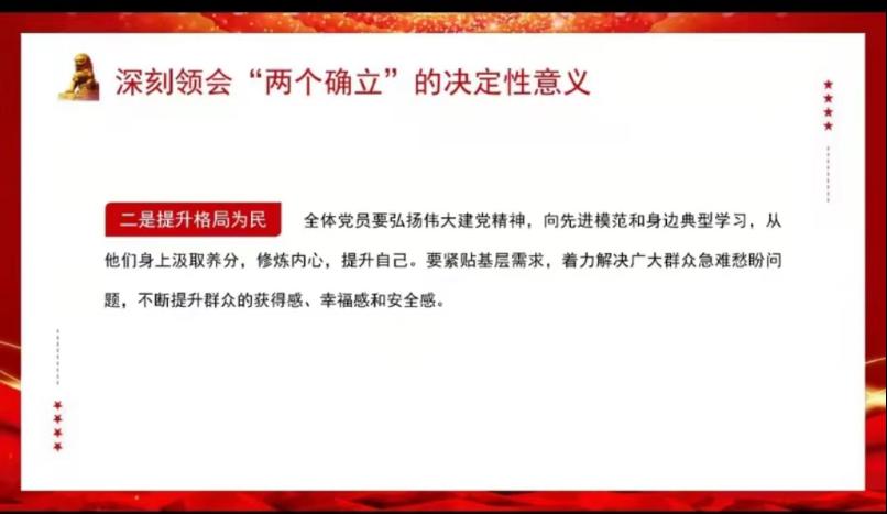 本次“喜迎二十大”主题党课活动在参会全体党员中收获了良好的反响,并在党课结束后开展了气氛热烈的讨论,进一步筑牢了全体党员的党性修养,促进了每一位党员以最饱满的精神姿态迎接二十大的到来。