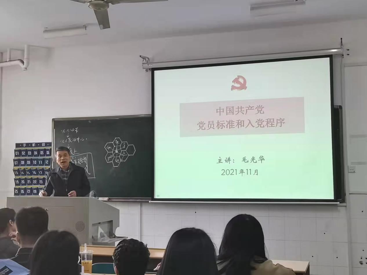 2021年11月13日下午2:30,马克思主义学院2021年下期入党积极分子培训班的第四次党课在金盆岭校区16教313教室进行。此次党课由毛光华老师为入党积极分子进行授课,主题为“中国共产党党员标准和入党程序”。马克思主义学院、建筑学院、经管学院全体入党积极分子参加。