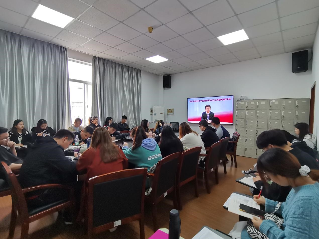 此次党课分为网络视频课程和课堂讨论两个环节。网络视频课程由中央党校(国家行政学院)马克思主义学院教授陈曙光讲授,讲题为“习近平新时代中国特色社会主义思想概述”。首先,陈曙光教授讲述了习近平新时代中国特色社会主义思想的历史背景;其次,讲述了习近平新时代中国特色社会主义思想的科学内涵进;最后,讲述了习近平新时代中国特色社会主义思想的历史地位。看完网络视频课程后,在党员张子豪的主持下,各位入党积极分子围绕习近平新时代中国特色社会主义思想的主题展开了积极地交流讨论。如积极分子朱灵安说:“在学习习近平新时代中国特色社会主义思想时,我对文化自信这一部分感触格外深,在当今时代,我们应该以“中学”为体,“西学”为用,在我国本土思想的基础上,发扬文化自信,塑造中国特色的文化,来解决世界问题。”积极分子陈媛说:“习近平新时代中国特色社会主义思想,是我们党过去五年来取得的最为重大的理论创新成果,为我们推进中国特色社会主义新实践,实现中华民族伟大复兴中国梦,提供了强大的思想武器和行动指南,我们必须长期坚持并不断发展。”