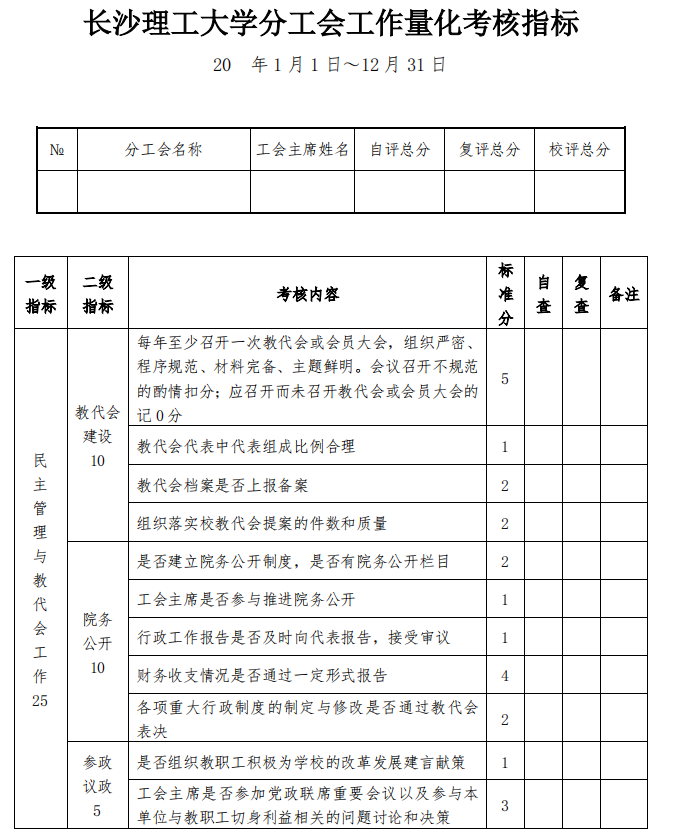 1.各分工会在撰写年度总结时,应按照上述考核内容和《LETOU体育平台分工会工作量化考核指标》给出自评分数,提交教代会或者按照教代会程序召开的教职工大会全部装订资料、年度工作计划和工作总结(含特色工作)。