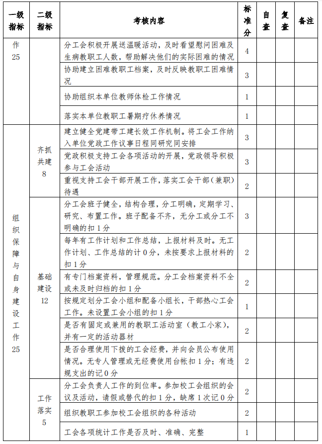 5.校工会对各分工会的自评情况进行复评,审定“考核分”和“附加分”,两者累加为考核“校评总分”。