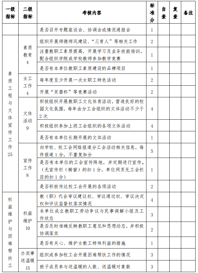 2.校工会原则上以各分工会平时上报的各种文字材料、活动 图片以及网页新闻等为依据对各分工会进行量化考核打分;对于 个别需上门检查的项目(如会议记录、学习记录),由校工会派人 检查(普查或抽查)。