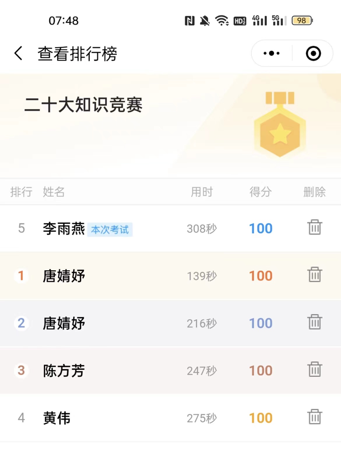 鉴于疫情防控工作需要,为了减少聚集,同时方便封控在家的老师参与答题,承办方几经修改方案,不断完善题库,理顺流程,最后经学院党政联席会议研究决定,本次活动通过网络答题竞赛的方式进行。到活动截止时间,学院共有教职工60多人参加了答题竞赛活动,在职在岗教师参与率达到100%,平均成绩达到90分,最高成绩达到100分。