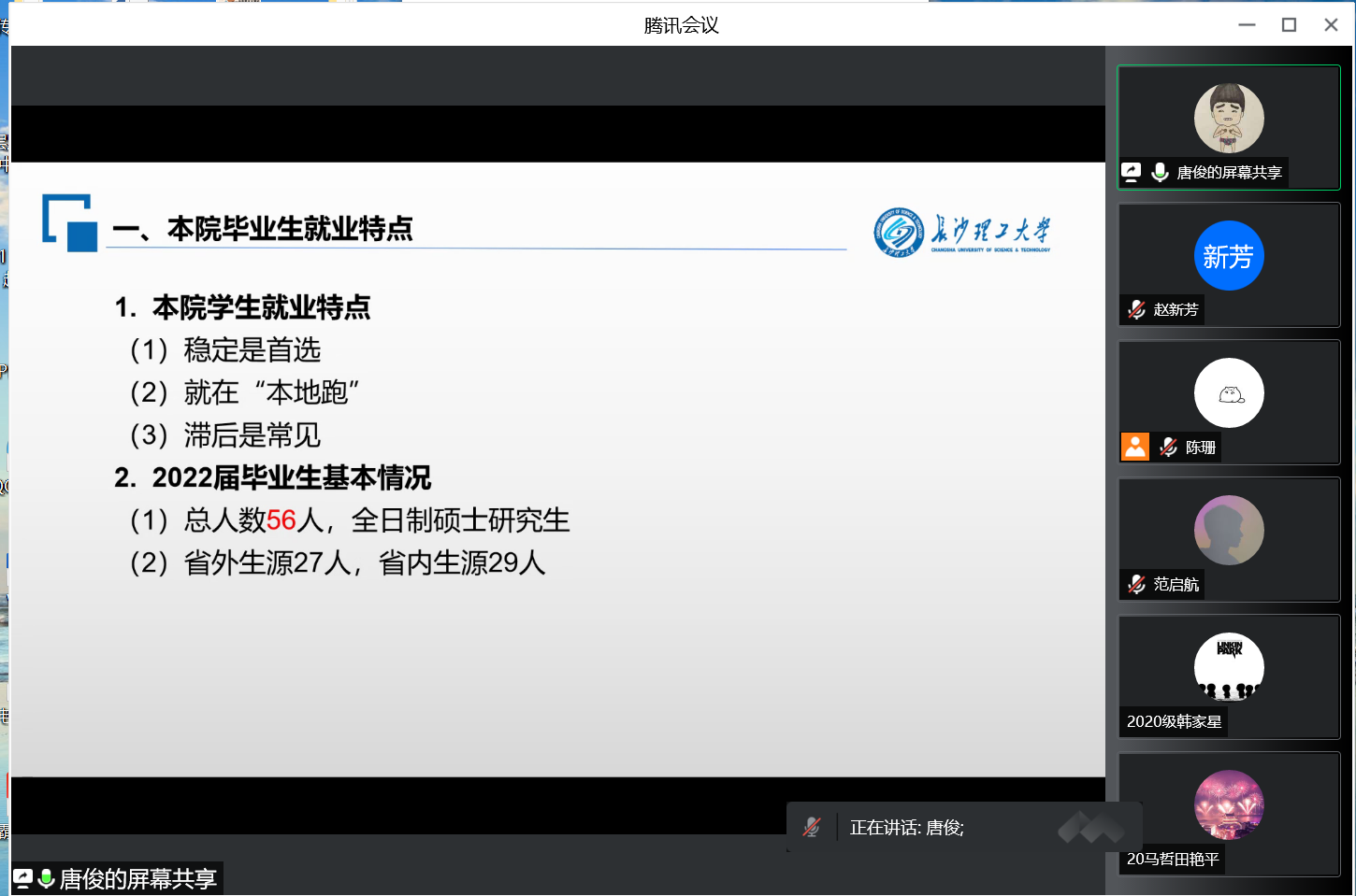 为进一步做好2023届毕业生就业工作,帮助其充分了解就业形势,树立正确的就业观念。2022年8月31日晚七点,马克思主义学院通过腾讯会议开展线上2023届毕业生就业动员大会。副院长唐俊、辅导员陈珊老师、2022届优秀毕业生代表段海庚、刘佳玲以及2023届全体毕业生参加了本次会议。本次会议由辅导员陈珊主持。