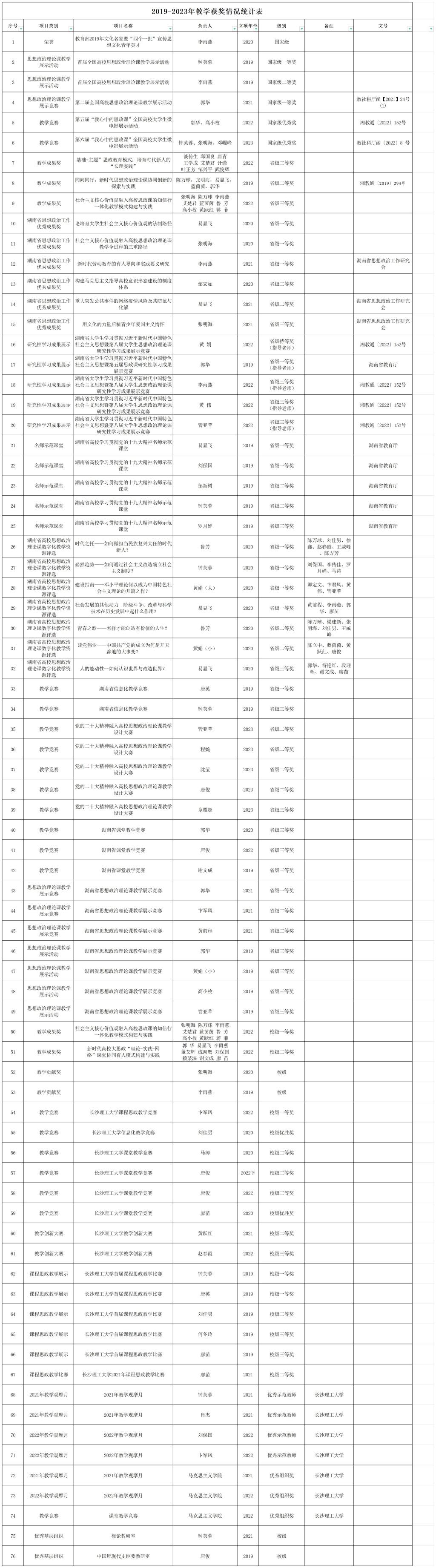 2019-2023年教学获奖情况统计表