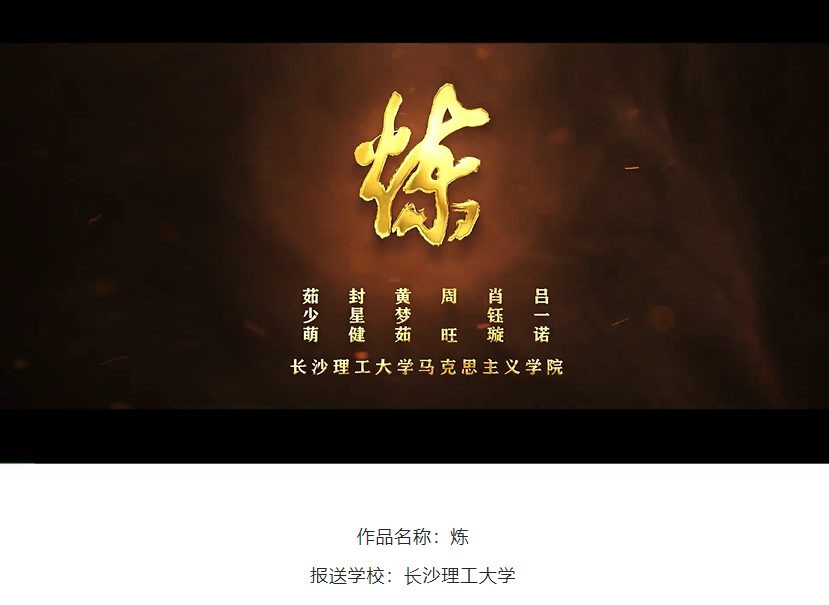 第六届“我心中的思政课”全国高校大学生微电影展示活动,由教育部社会科学司指导,教育部高校思想政治理论课教学指导委员会主办,武汉大学马克思主义学院承办,经过大学生评委初评、专家评委复评,共评选出275部获奖作品。《炼》紧跟时政,思想鲜明,展现了退伍复学的大学生参军报国、科技报国的理想由开始萌芽,到转化为报国信念和报国行动的成长历程。全面体现了思政课立德树人、为国育才、为社会主义培养建设者和接班人的育人理念,体现了思政课教师要做好学生锤炼品格的引路人、学习知识的引路人、创新思维的引路人、奉献祖国的引路人的育人要求,最终荣获全国高校大学生微电影展示活动优秀奖。