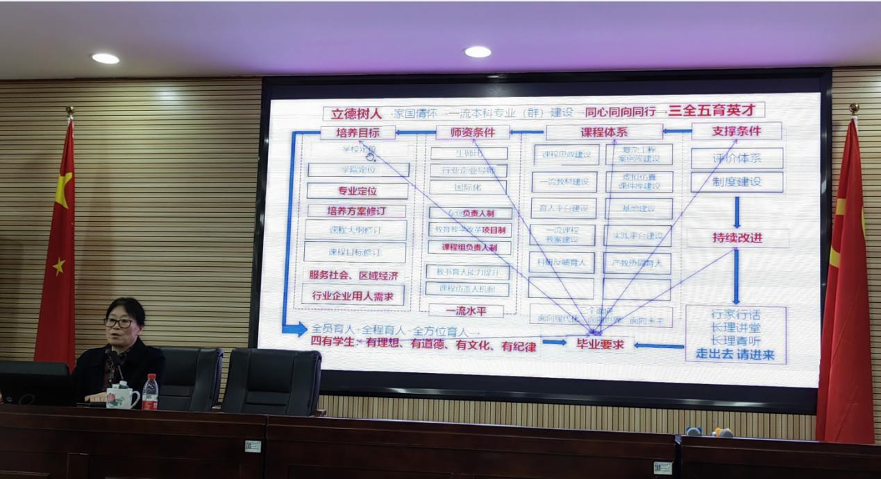 刘教授以河北工业大学一流专业建设为背景,介绍了他们为培养德智体美劳全面发展的学生做的专业建设顶层设计以及一些具体的专业建设经验,为我们专业建设和专业教学提供了很好的参考。刘教授强调了实验室、实习实践在整个人才培养体系中的重要地位,也具体说明了学校、学院、教师、学生在专业建设中的工作内容;她还提出了交叉学科融合下一流本科专业(群)新需求和新挑战的一些自己的思考,提出一流本科专业建设的初心在于“十年磨一剑,飞一年磨十剑”,强调“立德树人、教书育人、教学相长”永远在路上。