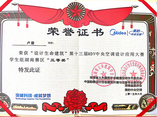 6月19日下午,第十三届MDV中央空调设计应用大赛学生组预选赛颁奖礼在湖南工业大学落下帷幕。来自湖南省九所高校、部分设计院的专家学者、获奖学生、媒体等近100人参加颁奖典礼。湖省暖通空调制冷学会主任委员、湖南省建筑设计院机电院院长袁建新高工,湖南工业大学副校长金继承教授等领导嘉宾亲临颁奖典礼现场并致辞,对MDV中央空调设计应用大赛及湖南地区学生组预选赛给予充分肯定和高度评价, 建环系赵李铁老师指导的学生参赛作品荣获第十三届设计大赛湖南赛区三等奖,作为下一届(第十四届)MDV中央空调设计应用大赛学生组预选赛的协办方,我院陈荐院长、田向阳副书记、建环系刘小波主任等7位老师应邀出席。