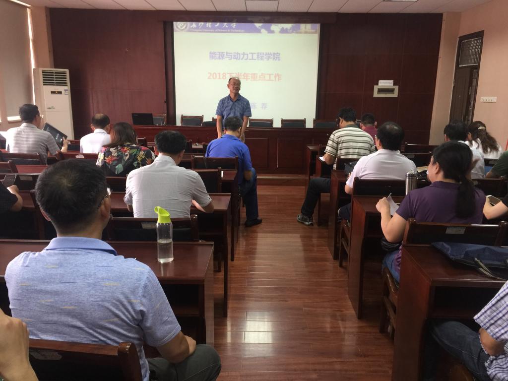 陈院长对2018年下半年学院将要开展的10项重点工作进行了布置,分别是:学院行政管理系统整体搬迁、实验室搬迁;加强学科学术带头人和优秀博士人才引进;修订分配方案;出台学院教学奖励办法;节能减排大赛省级平台申报;争取2019年第九届全国动力工程领域工程专业学位研究生教育协作组工作研讨会的承办权;动力工程及工程热物理和动力工程2个学位点合格评估;围绕学位点申报,以问题为导向,加强学科建设;加强与政府、企业及科研院所联系与合作,加强学术交流,提升科研实力;根据学校安排,进行专业技术人员岗位考评。