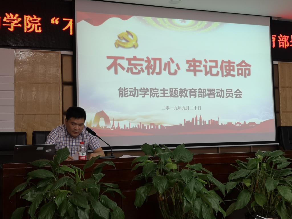 为深入扎实推进“不忘初心、牢记使命”主题教育工作,9月20日下午2:00,能动学院在新能源大楼502会议室召开了“不忘初心、牢记使命”主题教育部署动员会,全体教工党员和学生党支部支委成员参加会议,院长陈荐主持。