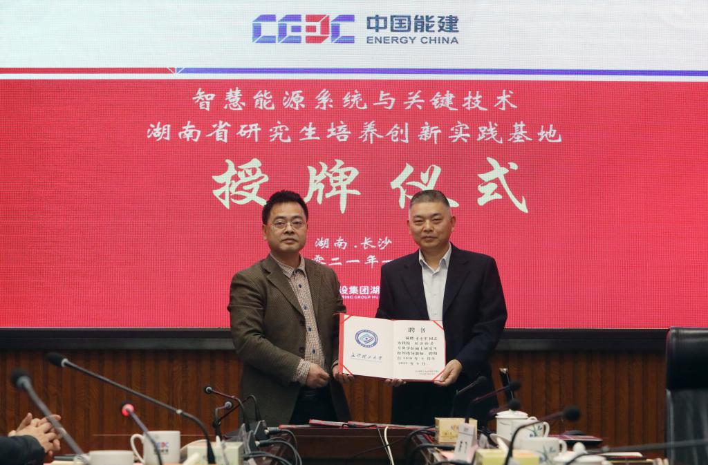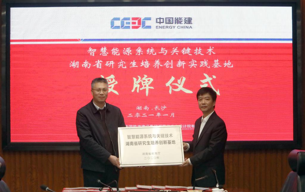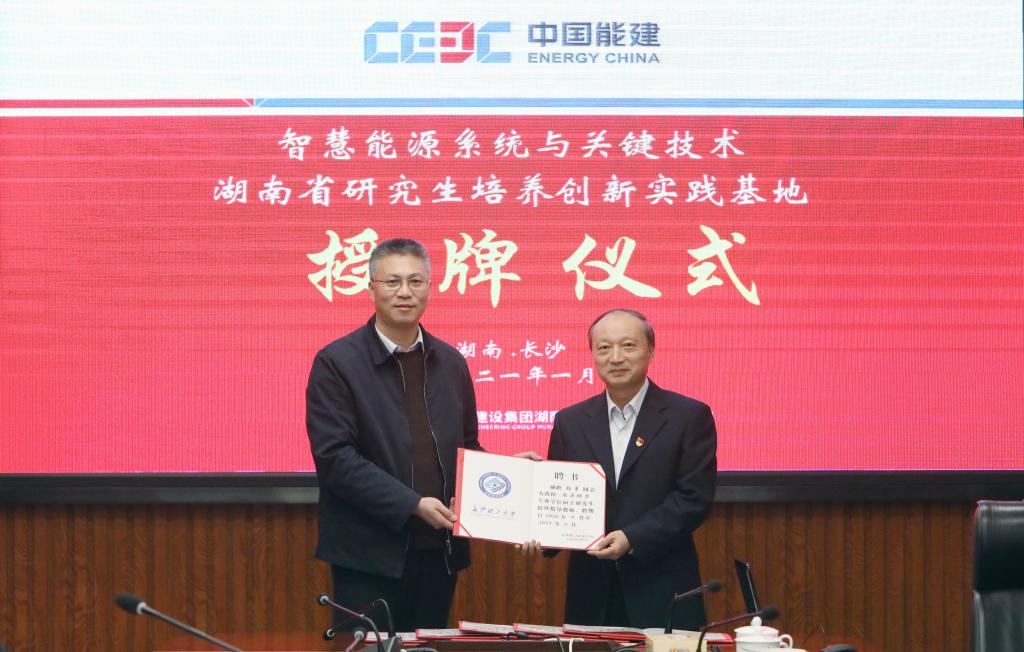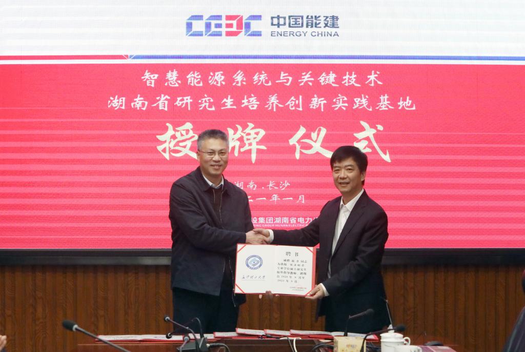 1月7日上午,“智慧能源系统与关键技术”湖南省研究生培养创新基地授牌仪式和校外研究生导师授聘书仪式在中能建湖南省电力设计院有限公司隆重举行,LETOU官网副校长蒋昌波,能动学院院长陈荐,副院长鄢晓忠、何建军及教授代表等参加。湖南省电力设计院党委副书记、总经理张力,总工程师兼副总经理颜勇,副总工程师李学军、戴秋华,副总经济师、人力资源部主任郭先浩,副总工程师、电源分公司总经理曾华林,科技质量环保部主任陈飞,首席主任师、电源分公司副总经理郑建国等参加,授牌仪式由颜勇主持。