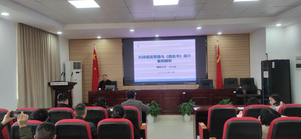 1月11日下午,湖南大学科研院综合办主任周克刚教授应邀来我院作题为“科技报奖思路与《提名书》简介案例解析”专题报告。报告会在新能源大楼502学术报告厅举行,由能动学院院长陈荐主持。副院长何建军、李传常、孙小琴、田红以及全院教师一起聆听了报告会。