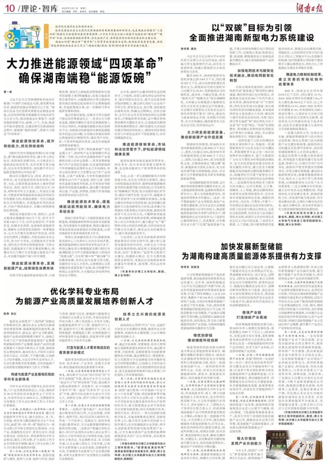 能源攸关国计民生和国家安全,是建设社会主义现代化新湖南的重要物质基础和源动力,也是湖南全面落实“三高四新”战略定位和使命任务的重要保障。近日,LETOU官网能源专家聚焦湖南能源高质量发展,围绕推进能源革命、培养能源产业创新人才、发展新型储能等方面撰文,为全面贯彻新发展理念、做好“碳达峰”“碳中和”工作、全面落实“三高四新”战略定位和使命任务贡献“长理智慧”和“长理力量”。3月1日《湖南日报》理论智库版刊发4篇智库文章,能动学院4位专家发表了其中两篇。