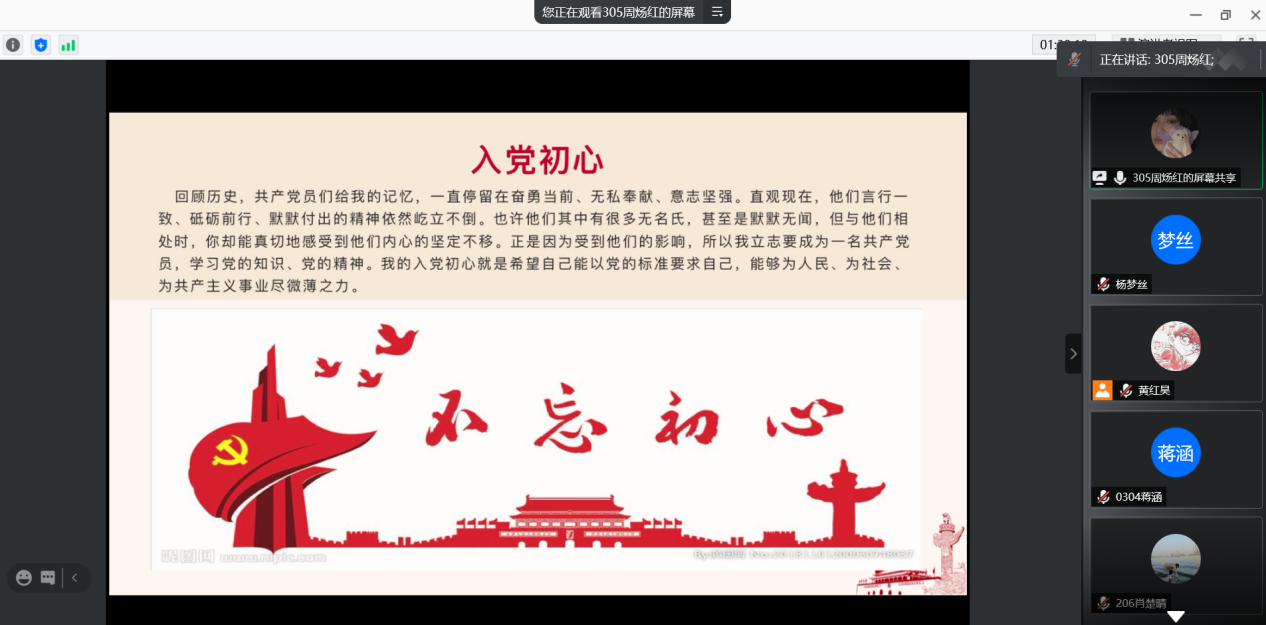 分享会按照年级及班级顺序开展,每位同志均通过展示幻灯片的形式分享自己的党史学习心得。关于学习党史的感想与领悟,龚蕴涵同志表示:要牢记16个字“为中国人民谋幸福,为中华民族谋复兴”。对于自己的入党初心,周炀红同志则表示:希望自己能以党的标准要求自己,能够为人民、为社会、为共产主义事业尽微薄之力。陈紫欣同志则介绍了关于党的新闻史,她表示:党的新闻事业是为党服务的,同时也是党宣传纲领路线的平台,也是党历史的见证者之一。