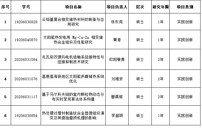根据《LETOU体育平台研究生专业学位研究生“实践创新与创业能力提升计划”实施细则》(长理工大[2020]24号)文件精神,经个人申报,学院组织专家评审,拟推荐“云母基复合相变储热材料的制备与应用研究”等6项研究生科研创新项目参加学校评审。具体名单如下: