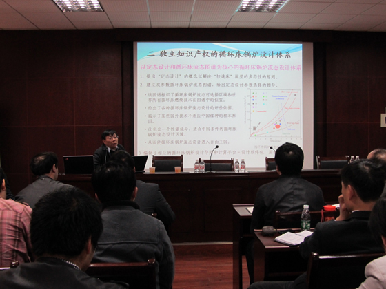 岳光溪院士回顾了自己多年科研工作的经历,介绍了循环流化床燃烧的理论与实践,以及其具有独立知识产权的循环流化床设计体系及其应用与产业化;指出了循环流化床发电技术有着适合劣质燃料、燃烧中脱硫、保护环境等方面的优点。同时,岳院士通过展示自己的科研成果,将自己的研究经验“实践—理论—实践”传授给大家,让在座的师生受益匪浅。随后,他给大家展示了循环硫化床燃烧技术的未来前景和科学研究及创新的思维方法。最后,能动学院院长陈冬林教授对报告会作了小结并对岳院士的精彩报告表示衷心的感谢。