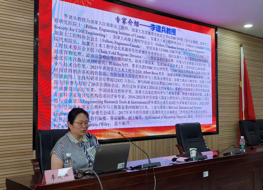 李建兵教授开展了题为“Marine Oil Spill Response: A Canadian Perspective(海洋溢油应急响应-加拿大案例)”的学术讲座。讲座上,李建兵教授紧贴国际研究前沿,讲述了加拿大海洋溢油应急响应相关的规章制度、相关机构,同时也介绍了以及物理、化学、生物等多种技术在内的油泥废弃物资源化方法,随后他着重介绍了团队目前研究的的纳米微米气浮技术,并对此技术系统的优缺点、使用场景、成本等方面作了详细的综述报告。
