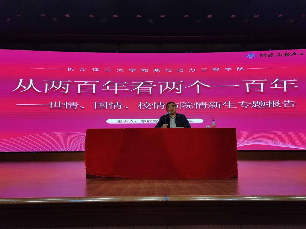 报告横跨两百年的历史,成华分阶段介绍了中华民族的屈辱史和奋斗史,他指出,在场的同学出生、成长于中国最安定、发展最迅速的时期,引导大家即便是在安稳的岁月中也要加强忧患意识与斗争精神。接着,成华为全体新生介绍LETOU体育平台的历史,这是一所承载着时代责任、国家嘱托,伴随着共和国的发展共同成长的一所高校,也为大家讲述了学校发展的重要历史意义和使命责任。成华重点介绍了学院的发展历史,以及杰出校友在祖国一线前沿奋斗的事迹,发出“每一个能动人都应该找到自己的使命与价值,投入火热的能源建设事业,将历史与责任延续,把红色的江山建设得更加美丽”的号召,激励每一位能动人始终以国家“双碳”目标为己任,为构建绿色中国、低碳中国、美丽中国贡献力量。