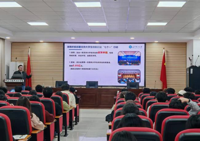 辅导员彭博以“背上双肩包,来湖南创业吧!”为主题向各班班干部、学生代表详细解读湖南省积极部署支持大学生创新创业“七个一”行动。他鼓励大家积极参与金种子大赛,更好地提升自己的创新创业能力。
