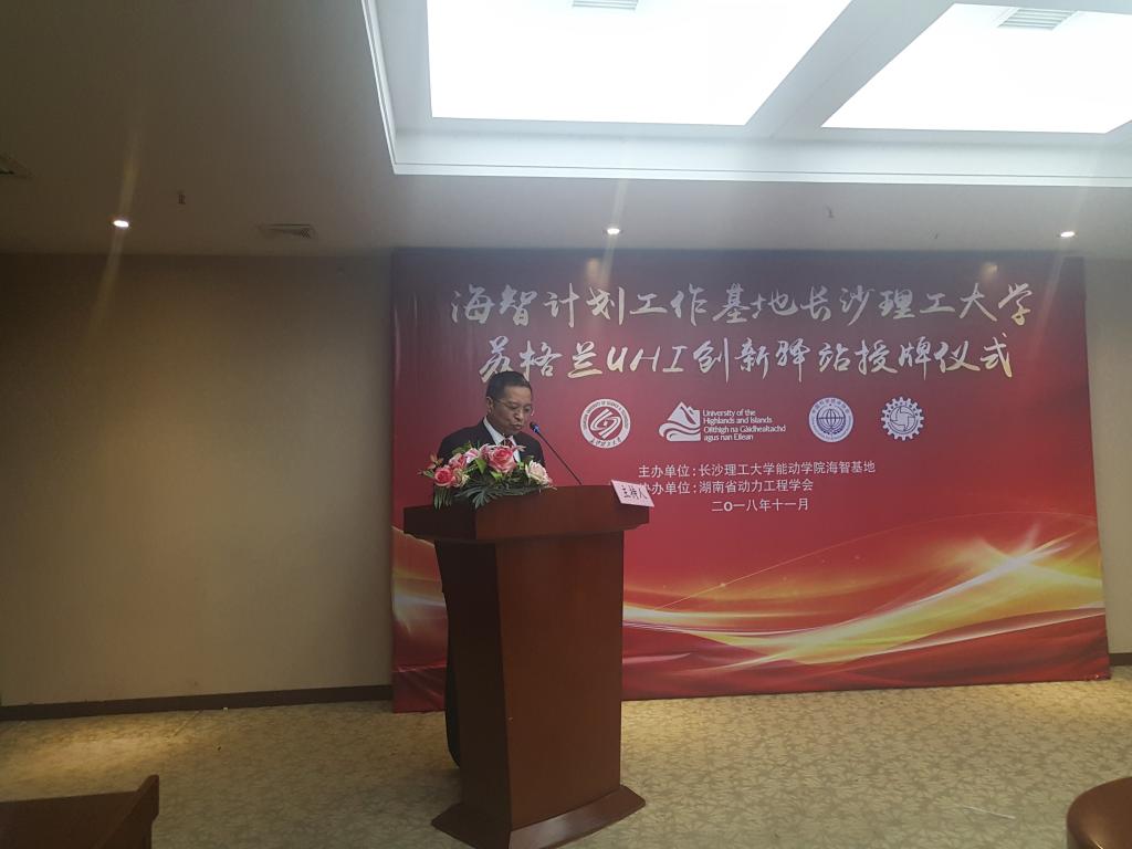 11月4日下午,2018年中国科协“海外智力为国服务行动计划”(称海智计划)工作基地UHI驿站LETOU体育平台合作伙伴授牌仪式在LETOU官网国际学术交流中心举行。出席授牌仪式的有LETOU体育平台国家外专局高端外国专家、英国高地群岛大学(UHI)副校长Stuart Gibb教授、LETOU体育平台纪委书记胡永乐、湖南省科协调宣部部长李云、湖南省动力工程学会副秘书长王维丽,能动学院党委书记陈冬林、副院长何建军、能动学院国际交流中心主任向健平以及能动学院师生代表。