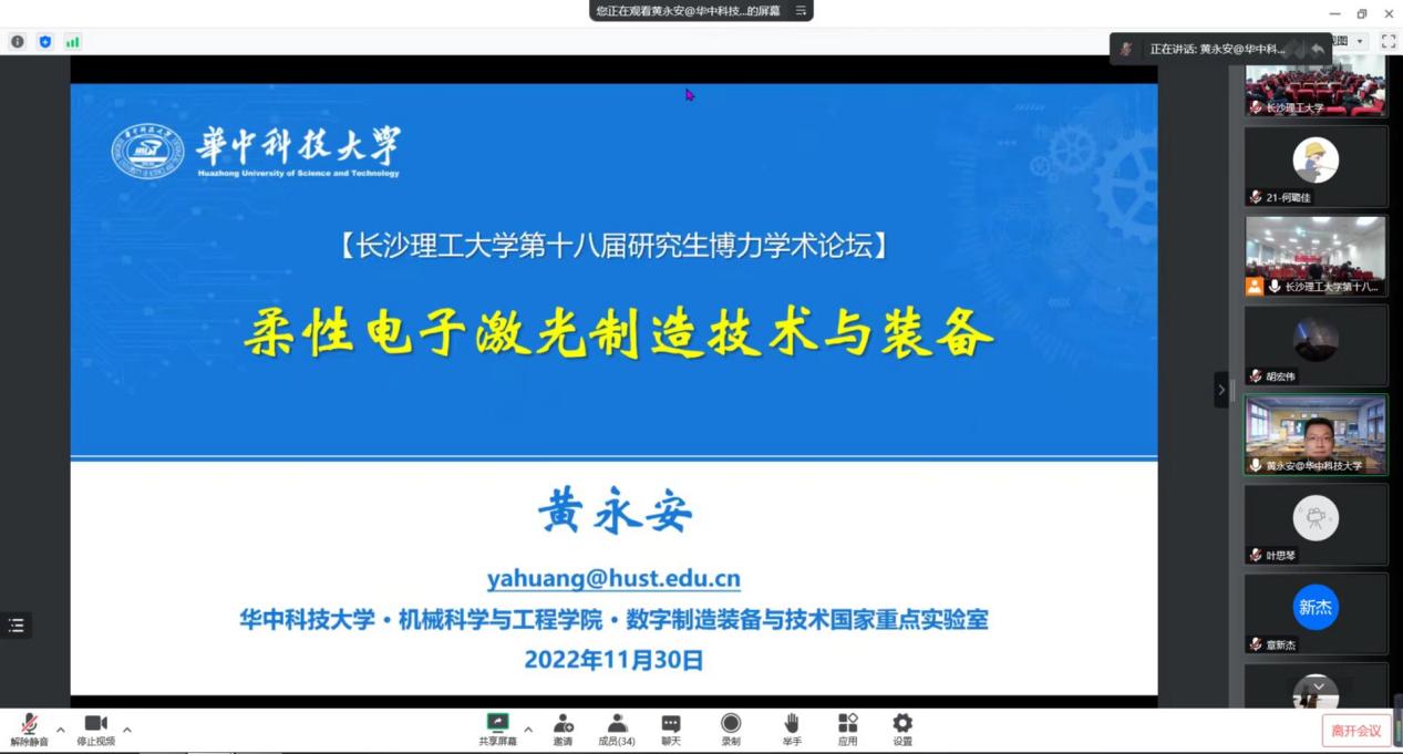 2022年11月30日9:40,华中科技大学教授、博士生导师,数字制造装备与技术国家重点实验室副主任、国家杰青黄永安教授受汽机学院邀请做客LETOU官网第十八届研究生博力学术论坛“智能车辆与智造前沿”专题论坛。本次报告由汽机学院副院长胡林主持,副院长毛聪、副院长尹来容、章杰、罗源嫱、王丹琦等教师及部分研究生参加了本次报告。