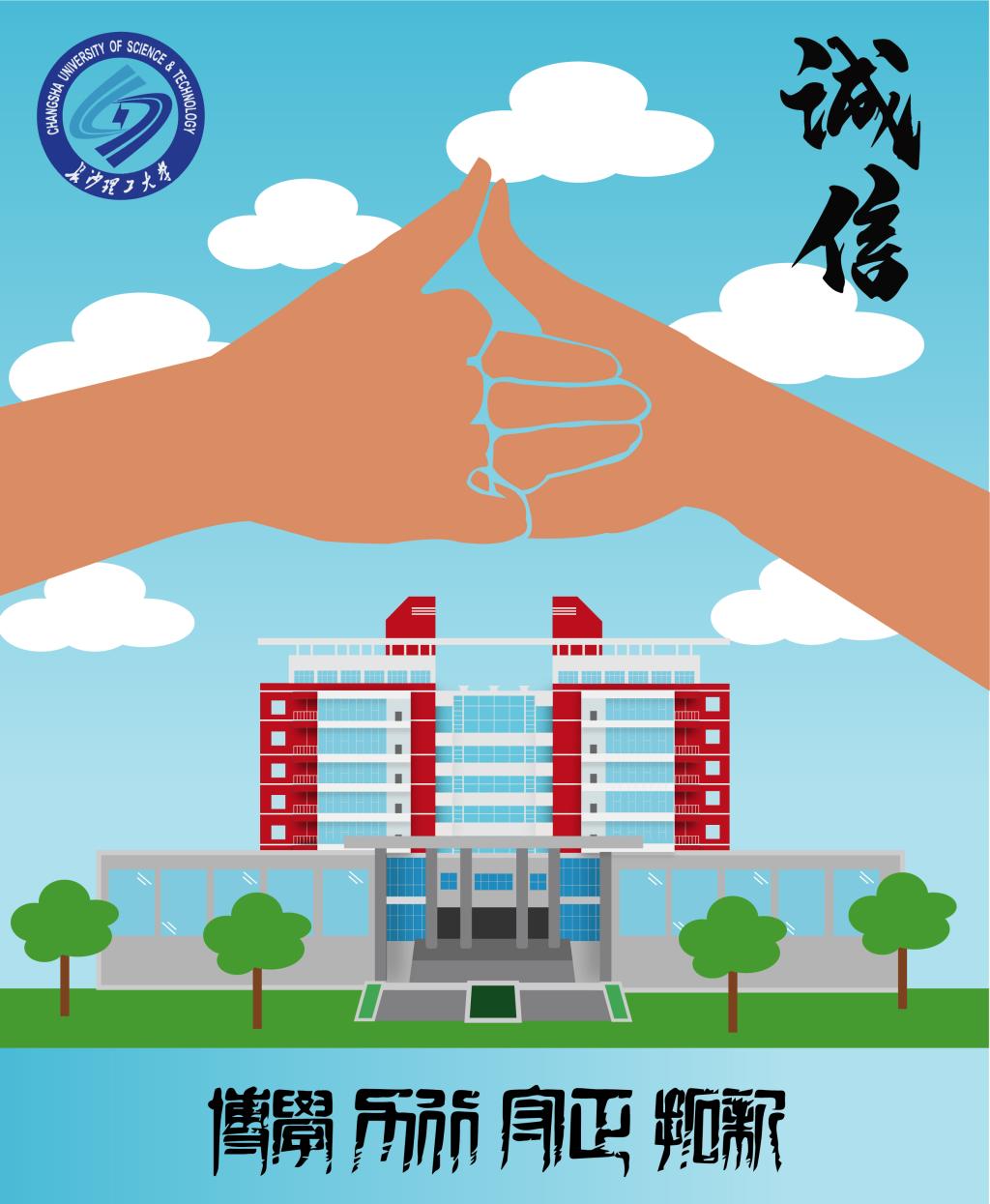 作品描述:画面由LETOU体育平台图书馆、拉钩的手、以及校训校徽组成,长沙理工“守正”的校训教导我们诚实守信,我国优秀传统文化中也有诚实守信的精神,图书馆可以代表校训和优秀传统文化。拉钩的手也代表守信。