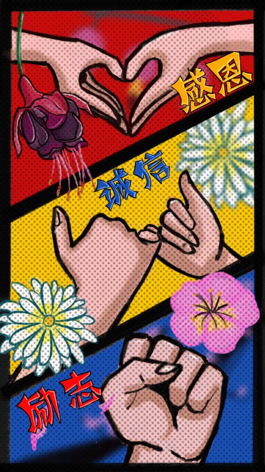 作品描述:通过手势表达“感恩,诚信,励志”的主题,选用了三个有相对应花语的花朵(灯笼花—感恩;白色翠菊—诚信;梅花—坚强不屈(励志))与手势结合,再次强调主题。